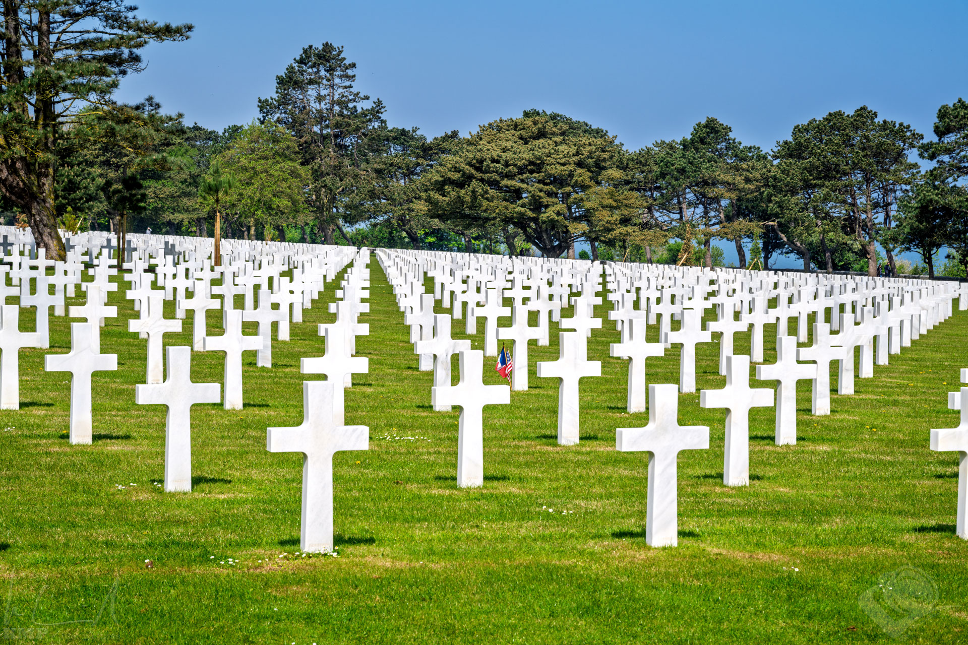Hier liegen 9’000 amerikanische Soldaten begraben. Diese Soldaten waren ursprünglich auf verschiedenen temporären Soldatenfriedhöfen begraben worden. Ihre Angehörigen konnten dann entscheiden, ob die sterblichen Überreste in Colleville-sur-Mer begraben oder nach Hause in die USA gebracht werden sollten.